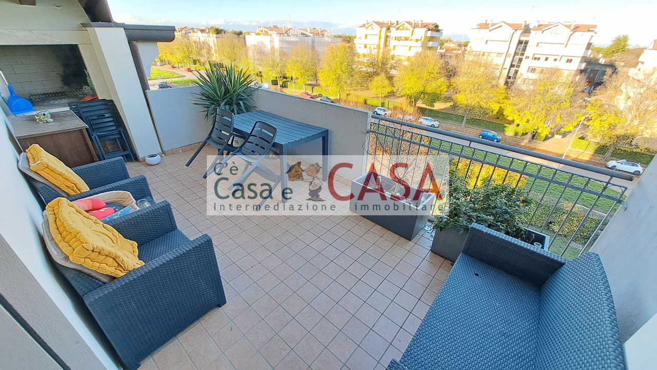 S.DOMENICO: Ottimo contesto abitativo, vicinanze a tutti i servizi, autobus, farmacia, scuole, comodo alla tangenziale curva Boston per raggiungere in breve tempo Padova, INEDITO PANORAMICO ATTICO-DUPLEX con ascensore, in recente residence del 2003, disponibile per l’estate 2026 e composto da ampio reparto giorno di 40mq con cucina separata di 12mq entrambi con sfogo nel poggiolo lungo tutto il fronte principale ad ovest, disimpegno notte con camera matrimoniale e bagno con sfogo nel poggiolo, scala in legno che conduce al reparto sottotetto tutto travato a vista e composto da zona living-studio finestrato con adiacente terrazzo panoramico di 15mq dotato di barbecue, due comode stanze di cui una servita da poggiolo ed infine un bagno comodo con velux motorizzato. FINITURE di buon gusto!!!!!
